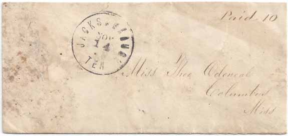 TN433 | Stampless PAID cover with the small single rim Jacksborough, Ten CDS (Campbell County) and manuscript "Paid 10"
