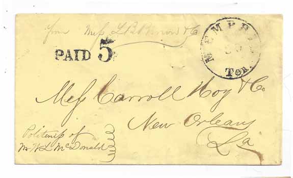 Stampless PAID cover with the Memphis, Ten CDS and handstamp PAID 5