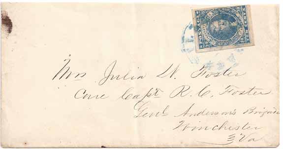 CSA #2 H&L Position 16 (three good margins but just touching at the bottom right) affixed sideways and tied by the BLUE Nashville, Ten CDS with a JAN (1862) date. Addressed to Mrs. Julia W. Foster Care Capt R. C. Foster, Genl Anderson's Brigade, Winchester, Va. Small