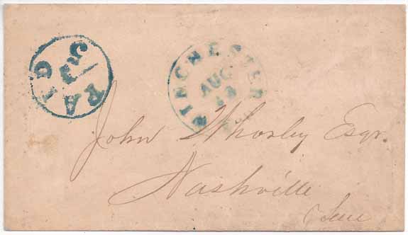 | TN458 | Stampless PAID cover with the BLUE Winchester, Ten CDS 13 AUG (1861) and matching BLUE handstamp PAID 5 Type A. Addressed to John Whorley Esqr., Nashville, Ten. John W. Whorley (1829-1909) was a succesful Nashville tobacco merchant. No record of military service. Sealed back flap opening tear, otherwise Very Fine. Ex-Kohn, Ex-Gallagher. | $250.00 |