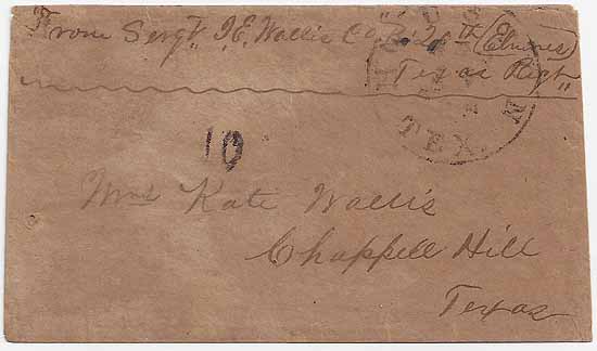 | TX130 | Soldiers (Due) 10 with the Houston, Tex CDS Dietz Type B (date not apparent). Endorsed across the top “From Sergt J. E. Wallis 20th (Elmores) Texas Regt.” Clean coarse paper cover addressed to Mrs. Kate Wallis Chappell Hill, Texas. The 20th Texas Regt essentially spent the war guarding the Texas coast in the Galveston area. Very Fine. | $250.00 |