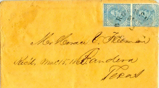 | TX313 | CSA #7 Vert Pair (margins a little close) tied by the rimless Brownsville, Tex CDS 2 MAR (1865). Very late Use. Orange paper cover addressed to Mr. Horace V. Freeman, Bandera, Texas. Receiving docketing on the front of the cover “Rec’d Mar 15, 1865” confirms the year of use. A little edge wear but still a very clean cover. | $400.00 |