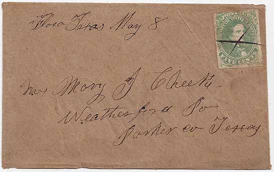 Coarse brown paper cover addressed to Mrs Mary J Cheek, Weatherford PO,