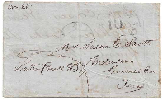 Addressed to Mrs. Susan E. Scott, Anderson, Grimes Co., Texas. "Lake