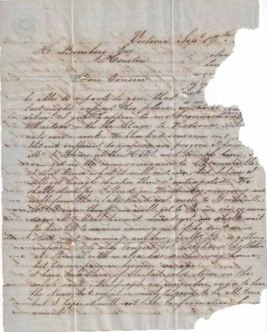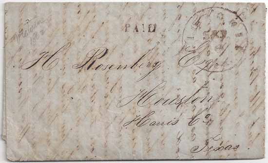 Stampless cover with the Victoria, Tex CDS and handstamp PAID (no rate) Type A 16 SEP (1862). Addressed to C. Rosenberg Esq, Houston, Harris Co., Texas.