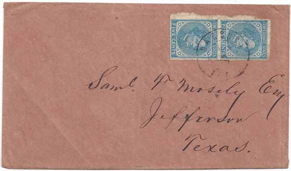 TX389 | CSA #7 Vert Pair affixed sideways (4-Margin) tied by a somewhat weak but recognizable strike of the small double circle Marshall, Tex CDS with a MAY date. Light coarse brown paper cover which appears to be homemade addressed to Saml F. Mosely Esq, Jefferson, Texas. Very Fine appearing cover. | $225.00 |