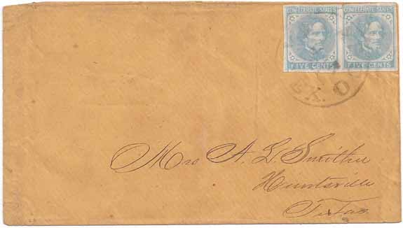 TX391 | CSA #6 Horz Pair (4-Margin) tied by the Velasco, Tex CDS 31 MAR. Orange paper cover addressed to Mrs. A. L. Smith, Huntsville, Texas. Very clean cover. | $200.00 |