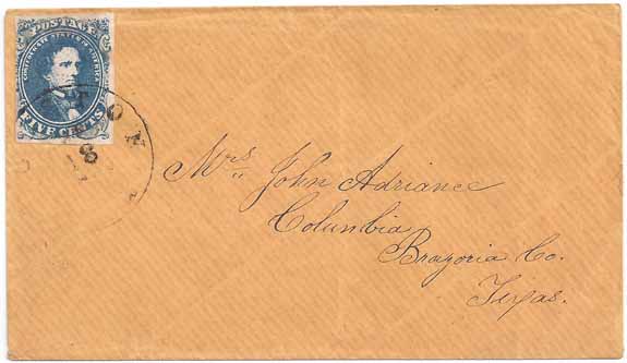| TX392 | CSA #4 Stone 2 Position 35 (margin touches at the left) tied by the usual partial strike of the Houston, Tex CDS 18 APR (1862). Orange paper cover from the well-documented Adriance Correspondence addressed to Mrs. John Adriance, Columbia, Brazoria Co., Texas. Very Fine, Ex-Tate. | $400.00 |