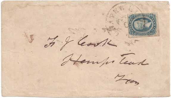 First Use (outside) CSA #11 (AD) 4-Margin but close at the top and the right) tied by the Chapel Hill Tex CDS FEB (1865). Addressed to F. J. Cook, Hempstead, Texas.