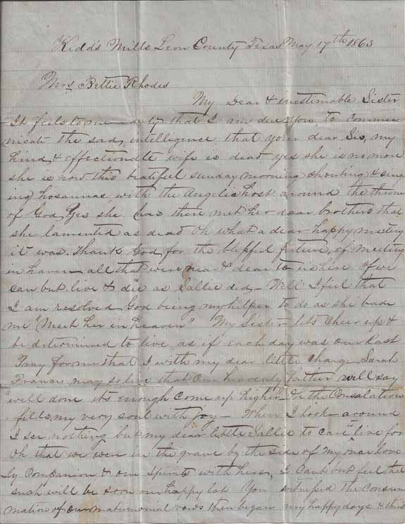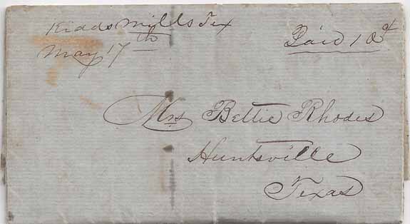 Stampless PAID cover "Kidds Mills Tex May 17th (1863) Paid 10c" all in manuscript. Blue paper folded letter addressed to Mrs. Bettie Rhodes, Huntsville, Texas. The letter is datelined "Kidds Mills Leon County Texas May 17th 1863" and is signed "W. F. Kidd."