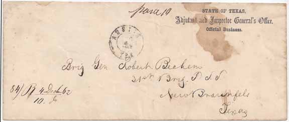 Stampless PAID cover with the small double circle Austin, Tex CDS 4 DEC 1862 and manuscript Paid 10. Oversized cover with State Imprint at the top right "State of Texas, Adjutant and Inspector General's Office. Official Business." (CC S-TX-02). Military address to Brig Gen Robert Bechem, 31st Brig TST (Texas State Troops), New Braunfels, Texas.