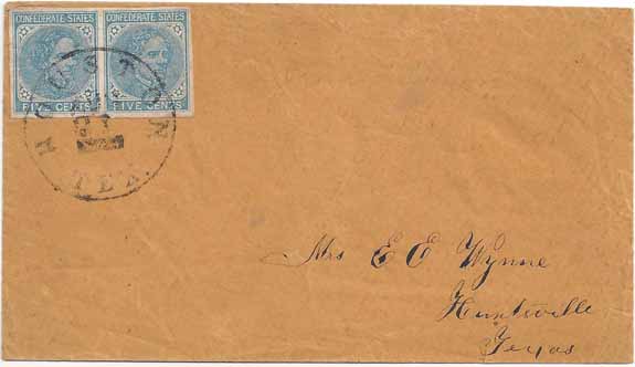 | TX432 | CSA #7 Horz Pair (4-Margin) tied by the Houston, Tex CDS 21 AUG. Orange paper cover addresed to Mrs E E Wynne, Huntsville, Texas. The addressee was the wife of Erasmus Wynne, a prosperous landowner and farmer in the Huntsville area. Minor back flap opening tear, otherwise Very Fine. B. R. Williams collector's handstamp on the reverse. | $200.00 |