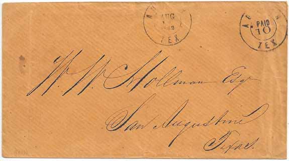 CSA #9XU1 Austin, Tex PAID 10 Provisional. Small double circle Austin, Tex CDS 12 AUG 1862. The provisional PAID 10 mark is the Austin postmark with the small "PAID 10" handstamp