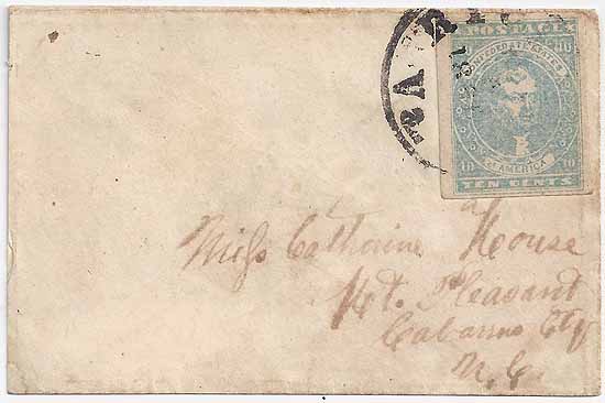 | VA1423 | CSA #2 Paterson Stone Y (4-Margin Light Milky Blue) tied by a partial strike of the Richmond, Va CDS (date not apparent). Very small lady's type cover with small embossed flower emblem on the middle of the back flap. Slightly reduced on the left not affecting anything. Addressed to Miss Catherine House, Mt Pleasant, Cabarras Cty NC. Clean cover and a beautiful stamp. | $300.00 |