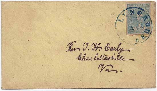 | VA1776 | CSA #2 Paterson Stone Y (4-Margin) tied by the Blue Lynchburg, Va CDS 7 OCT 1862. Addressed to Rev T. H. Early, Charlottesville, Va. Very Fine. | $375.00 |