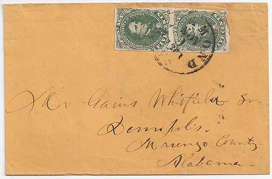 VA2186 | CSA #1 Stone A-B Vert Pair (stamps do not plate to Stone 1 so must be Stone A-B by the date of the cover) (margin just a little tight in spots at the right with some gum toning at the right lower corner and pair affixed sideways) tied by the Richmond, Va CDS Powell Type 2b 1 NOV 1861. Nice early use of the stamps. Orange paper cover addressed to Mr. Gaius Whitfield Sr., Demopolis Marengo County, Alabama. Reduced at the left not affecting anything, otherwise a very clean cover. | $350.00 |