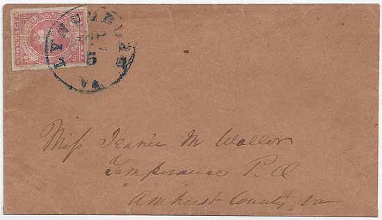 VA2212 | CSA #5 (4-Margin and a very nice deep rose color affixed sideways at the upper left corner) tied by a very decent strike of the BLUE Lynchburg, Va CDS 5 SEP (1862). Light coarse paper cover addressed to Miss Jeanie M. Waller, Temperance PO, Amherst County, Va. Very Fine. | $750.00 |