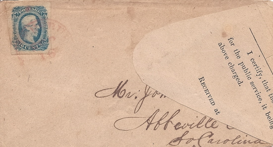 Addressed to Mr. John White, Abbeville CH, So. Carolina. Cover most