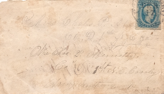VA2412 | CSA #12 (AD) (4-Margin) tied by the BLACK Petersburg, Va CDS 17 FEB (1865). Military Address to Mr. Chas P. Abernethy, Co D 1st NC Cavalry, Army Northern Va. Private Charles P. Abernathy enlisted in Co D 1st NC Cavalry from Lenoir County NC on 3/10/1864. He is listed as wounded on 8/15/1864 (no details given and no further record). Apparent turned cover with an address on the inside Miss M. S. Johnson, Happy Home with no postal markings. Happy Home is a listed post office in Burke County, North Carolina. Receiving docketing on the reverse states “Recg Feb 18th 1864” which is an incorrect year as the year must be 1865 because of the use of the balck Petersburg postmark and the known enlistment of Private Abernathy in March 1864. Cover with some minor edge faults and a little overall soiling but still quite presentable and a nice 1865 military usage. | $100.00 |