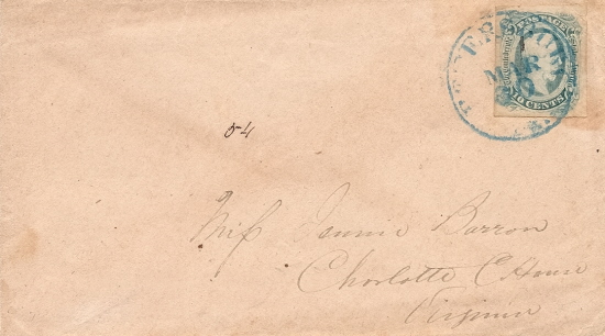 VA2466 | CSA #12c (AD) Greenish-Blue (4-Margin) tied by the BLUE Petersburg, Va CDS 30 MAR. Addressed to Miss Jennie Barron, Charlotte C. House, Virginia. Very Fine. Ex-John Hill. | $125.00 |