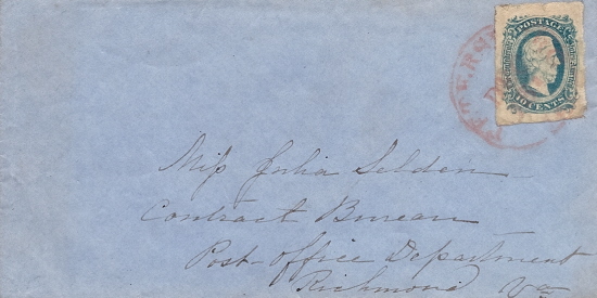 VA2473 | CSA #11 (AD) (4-Margin) tied by the RED Petersburg, Va CDS 15 DEC (1864). Blue paper cover addressed to Miss Julia Selden, Contract Bureau, Post Office Department, Richmond, Va. Very Fine. Signed by Brian Green. Ex-John Hill. | $150.00 |