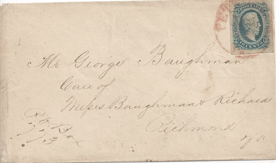 VA2614 | CSA #11 (AD) (4-Margin) tied by the RED Petersburg, Va CDS with a NOV (1864) date. Addressed to Mr. George Baughman Care of Messers Baughman & Richards, Richmond, Va PO Box 773. The firm of Baughman& Richards were Richmond stationers. Very Fine. | $200.00 |