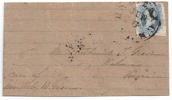 VA2665 | CSA #9 T-E-N (4-Margin with a prominent short transfer at the lower right where the lower right corner completely failed to print) tied by the Halifax CH, Va CDS 6 JUN 1863. This is only a part of a folded letter written on coarse brown lined notebook paper. Very nice stamp. | $350.00 |