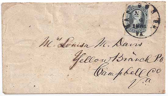 | VA2699 | CSA #9 T-E-N (striking color) (4-Margin but close on the left but with large margins right and bottom showing parts of the adjacent stamps) tied by a full strike of the Madison CH, Va CDS 4 NOV 1863. Addressed to Mrs. Louisa M. Davis, Yellow Branch PO, Campbell PO, Va. Small part of top back flap missing. Clean cover. Ex-Ezra Cole 1936. | $1,100.00 |