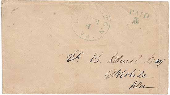 | VA2720 | Stampless Handstamp PAID 5 Type B with the Lexington, Va CDS all in BLUE 4 JUN. Not considered at this time to be a provisional use, but it could be. Addressed to F. B. Clark Esqr, Mobile, Ala. Cover appears to be underpaid as Mobile is more than 500 miles from Lexington, and there are no due marks. One back side flap is missing. Very clean appearance. Ex-Bogg. | $200.00 |