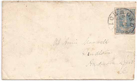 VA2730 | CSA #2 Paterson (4-Margin and a very coarse printing and affixed upside down) tied by the Richmond, Va CDS Powell Type 3f 2- SEP 1862. Addressed to Miss Annie Maxwell, Pendleton, Anderson Dist., SC. Minor reduction on the right not affecting anything. Very clean cover. Ex-Kohn. | $150.00 |