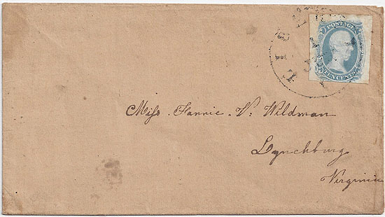 | VA2749 | CSA #9 T-E-N (three very large margins with margin just touching at the bottom) tied by the Liberty, Va CDS 1 JUN. Addressed to Miss Fannie V. Wildman, Lynchburg, Virginia. Very clean cover. | $900.00 |