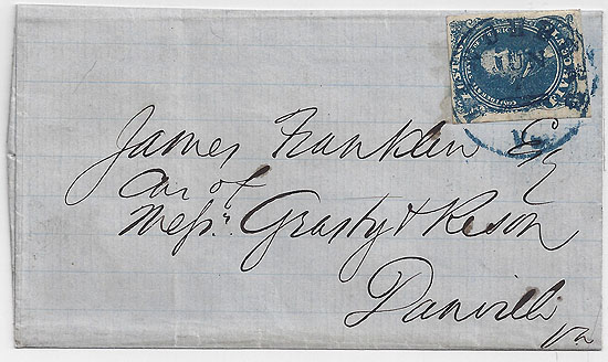 | VA2758 | CSA #4a Dark Blue Stone 2 Position 2 (4-Margin but close at the top) tied by BLUE Lynchburg, Va CDS 7 JUN (1862), Addressed James Franklin Esq, Care of Messers Grasty & Rison (merchants), Danville, Va. Folded cover from blue lined letter paper with no content. The page with the letter on it most likely removed some time in the past. Very pretty cover with blue paper, blue postmark, and a nice dark blue stamp. | $275.00 |