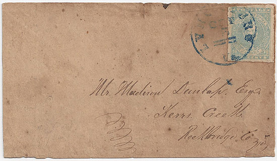 | VA2787 | CSA #2 Paterson Stone Y (4-Margin with a very minor clip at the upper left corner) tied by the BLUE Lynchburg, Va CDS 5 OCT (1862). Coarse brown paper cover addressed to Mr. Madison Dunlap Esqr, Kerrs Creek, Rockbridge Co., Va. Cover with light foxing and a little light staining and some edge wear but a clean appearance and a nice stamp. | $300.00 |