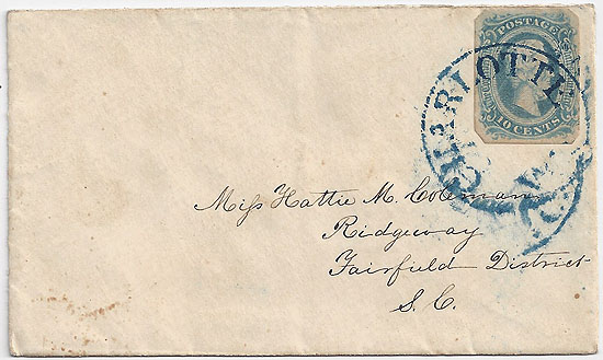 | VA2814 | CSA #11 (AD) (4-Margin) tied by the BLUE Dateless Charlotte, Va CDS. Addressed to Miss Hattie M. Coleman, Ridgeway, Fairfield District SC. Very Fine. | $225.00 |