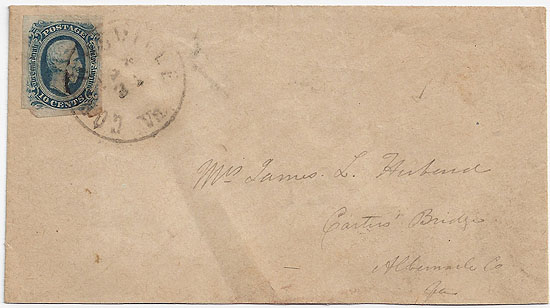 Carter's Birdge, Albemarle Co., Va. Very clean cover. James Lenaeus Hubard early in the war was the Lt Col of the 44th Va Inf but was dropped in the May 1862 reorganization. He later served as a Major (Quartermaster) on the staff of Brig-Gen B. H. Robertson's Cavalry Brigade. It would seem that this cover is most likely from Major Hubard to his wife. |