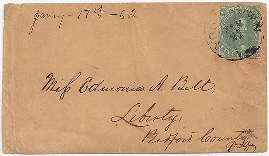 | VA2846 | CSA #1 Stone 2 Position 45 (margins a little irregular) tied by the Yorktown, Va CDS 21 JAN (1862). Addressed to Miss Edmonia A. Bett, Liberty, Bedford County, Va. Very clean cover. | $100.00 |
