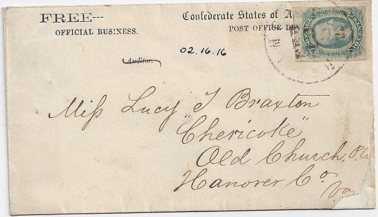 "FREE" invalid. Addressed to Miss Lucy T. Braxton,
