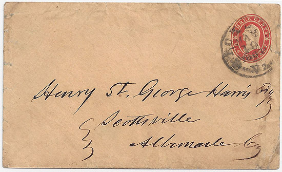 | VA2872 | USA Star Die with the Richmond, Va CDS Powell Type 1a 10 MAY 1861 which falls in the very limited USA Used in the CSA period for Virginia (5/7/1861-5/31/1861). Addressed to Henry St. George Harris Esqr, Scottsville, Albemarle Cty (Va). The addressee was a planter whose papers currently reside at the Duke University library. Light edge foxing and a back flap opening tear. Still a clean appearing and very presentable cover. | $100.00 |