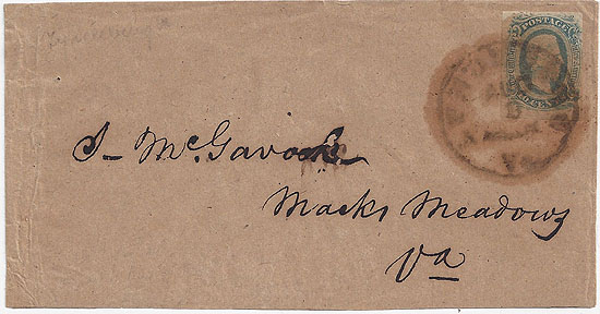 | VA2883 | CSA #11 (AD) (margin close on the right) tied by a very greasy Brown or Red-Brown strike of the Lynchburg, Va CDS 9 AUG. Addressed to J. McGavock, Macks Meadows, Va. | $200.00 |
