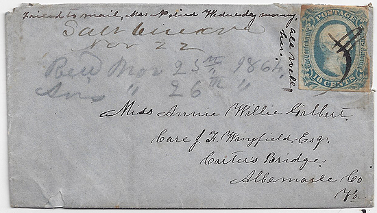 | VA2926 | CSA #12 (AD) (margin a little irregular at the right) pen-cancelled and manscript "Salt Creek Va Nov 22 (1864)" (Amherst County). Small blue paper l;ady's type cover addressed to Miss Annie Willie Gilbert Care of J. F. Wingfield Esq., Carter's Bridge, Albemarle Co., Va. Looks like the ending of the letter spilled over onto the outside top of the cover. Corner wear at upper left and a small repaired edge fault at lower left. | $75.00 |