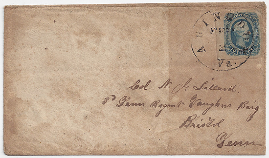 CSA #12 (AD) (4-Margin with a left sheet margin) tied by an Abingdon, Va CDS 2 SEP. Military Address to Col N. J. Lillard, 3rd Tenn Regmt Vaughns Brig, Bristol, Tenn. The regiment in the address was the 3rd Tenn Inf Provisional Army,