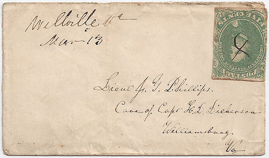CSA #1 Stone 2 (not plated) affixed upside down (margin in at left and edge gum toning) pen-cancelled and matching manuscript "Wellville Va Mar 13 (1862)" at the upper left. Obscure postal use from Nottoway County. Wellville was also a stop on the Southside Railroad. Military Address to Lieut J. Y. Phillips Care of Capt H. D. Dickerson, Williamsburg, Va. Joseph Y. Phillips (1840-1911) entered service as 2nd Lieutenant of Co C 53rd Va Inf on 8/12/1861. He was discharged 5/5/1862 when he failed re-election and had later service in Montague's Battalion Va Inf.