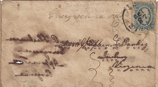 Turned Cover - First Use: CSA #12 (AD) (4-Margin) tied by the black Danville, Va CDS 5 SEP (1864) addressed to Mr. James P. Fleshman, Evergreen, Appomattox, Virginia. Second Use: CSA #12 (AD) (margin a little irregular at the right with manuscript postal marking "Evergreen Va Oct 12th 1864." Obscure