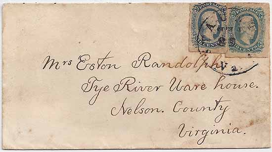 | VA2984 | CSA #11 (AD) (2 singles in two different color shades paying the double weight rate) (margin a little irregular at the top of the left stamp) tied together and to the cover by the Staunton, Va CDS (date not fully apparent). Addressed to Mrs. Eston Randolph, Tye River Warehouse, Nelson County, Virginia. The Randolph family was related to Thomas Jefferson. Back flap opening tears, otherwise Very Fine. | $200.00 |