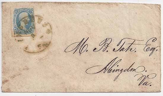VA3007 | CSA #9 T-E-N (margin touches at the right) tied by the greasy GREEN Lynchburg, Va CDS with a NOV date. Addressed to M. R. Tate Esq., Abingdon, Va. Clean cover. | $700.00 |