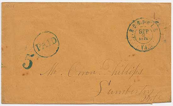 | VA3009 | Stampless cover with the small double circle BLUE Norfolk, Va CDS and BLUE handstamp PAID 5 Type D 8 SEP 1861. Orange paper cover addressed to Mr. Orren Phillips, Lumberton NC. Very Fine. Photocopy of a 1977 CSA Certificate. | $175.00 |