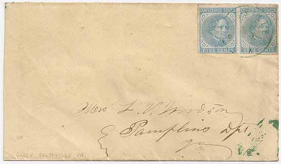VA3035 | CSA #7 Horz Pair (margins tight at right and bottom) tied by a somewhat weak but recognizable strike of the GREEN Saltville, Va CDS (date not apparent). Yellow paper cover addressed to Mrs. L. V. Woodson, Pamplins Dpt, Va. Clean cover. Green postmarks are not commonly seen. | $175.00 |