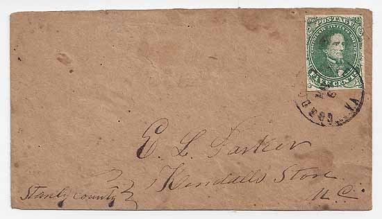 VA3043 | CSA #1b Dark Green Stone 2 Position 7 (4-Margin) tied by the small single rim Gordonsville, Va CDS 6 MAY (1861). Coarse brown paper cover addressed to E. L. Parker, Kendalls Store, Stanly County NC. Cover with a little light staining. Ex-Powell. | $150.00 |