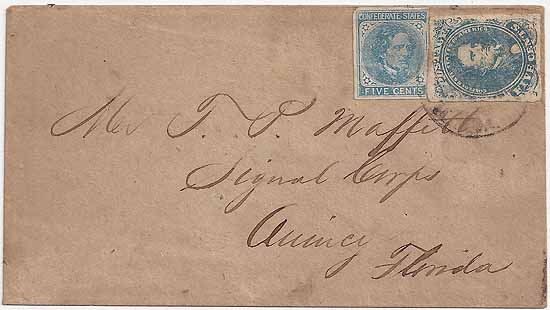 CSA #4 Stone 2 (not plated) (dry printing with small short transfers at the bottom corners and a few minor faults which do not detract and CSA #7 (somewhat irregular margin on the right) used in combination to make the 10c rate. Tied together and to the cover by a partial strike of the Richmond, Va CDS (dtae not apparent). Military Address to Mr. T. P. Maffett, Signal Corps, Quincy, Florida. Very clean cover.
