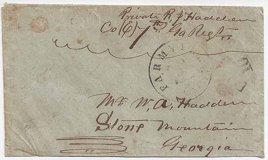 Stampless Cover Soldiers Due 10 with a partial strike of the Farmville, Va CDS with a MAY date and also a partial strike of the arc Due 10 handstamp. Endorsed at upper right “Private R. J. Hadden Co E 7th Ga Regt.”